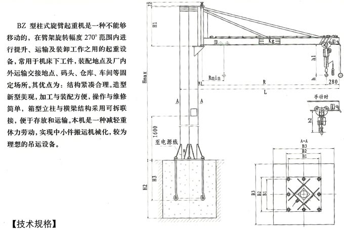 BZ型柱式旋轉起重機是一種不能夠移動的,在臂架旋轉幅度270°范圍內進行提升,運輸及裝卸工作之用的較為*的起重設備。常用于機床下工件,裝配地點及廠內外運輸交接地點、碼頭、倉庫、車間等固定場所。