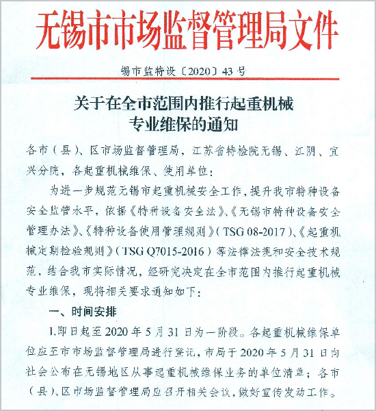 • 1.即日起至2020年5月31日為一階段。各起重機(jī)械維保單位應(yīng)至市市場(chǎng)監(jiān)督管理局進(jìn)行登記,市局于2020年5月31日向社會(huì)公布在無錫地區(qū)從事起重機(jī)械維保業(yè)務(wù)的單位清單;各市(縣)、區(qū)市場(chǎng)監(jiān)督管理局應(yīng)召開相關(guān)會(huì)議,做好宣傳發(fā)動(dòng)工作。
